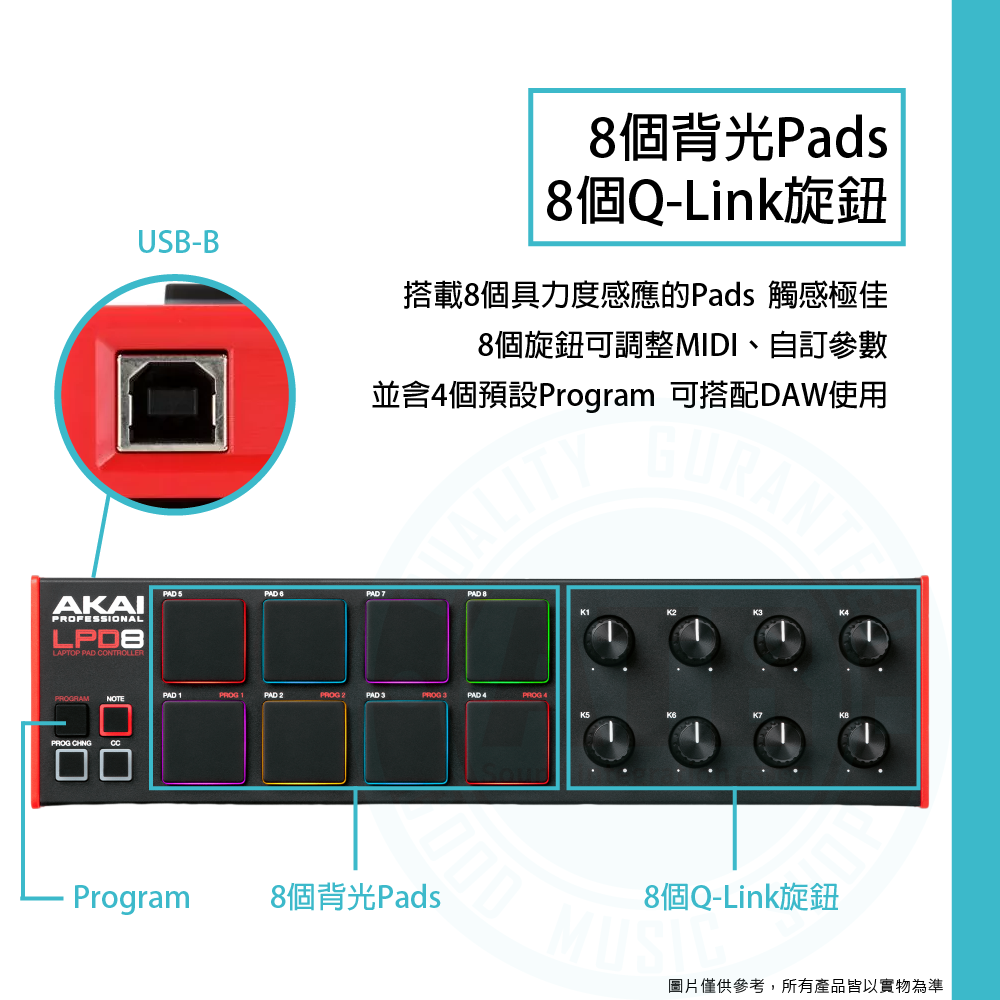 ◆ 8個背光Pads、8個Q-Link旋鈕、4個預設Program