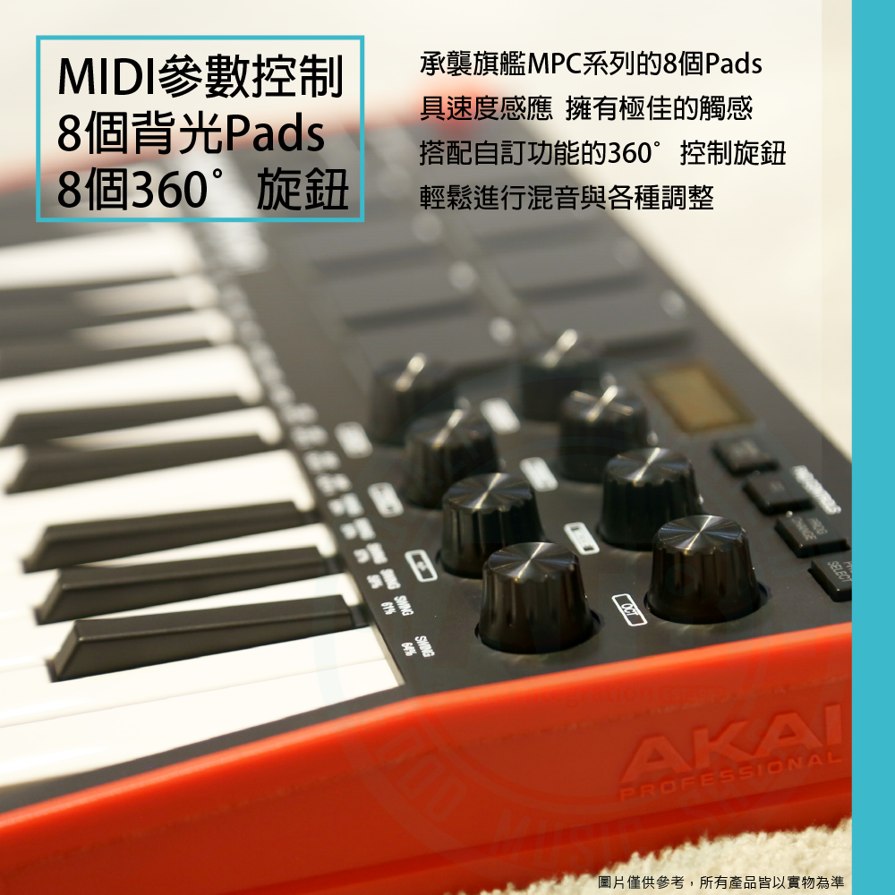 ◆ MIDI參數控制:8個背光Pads、8個360°旋鈕