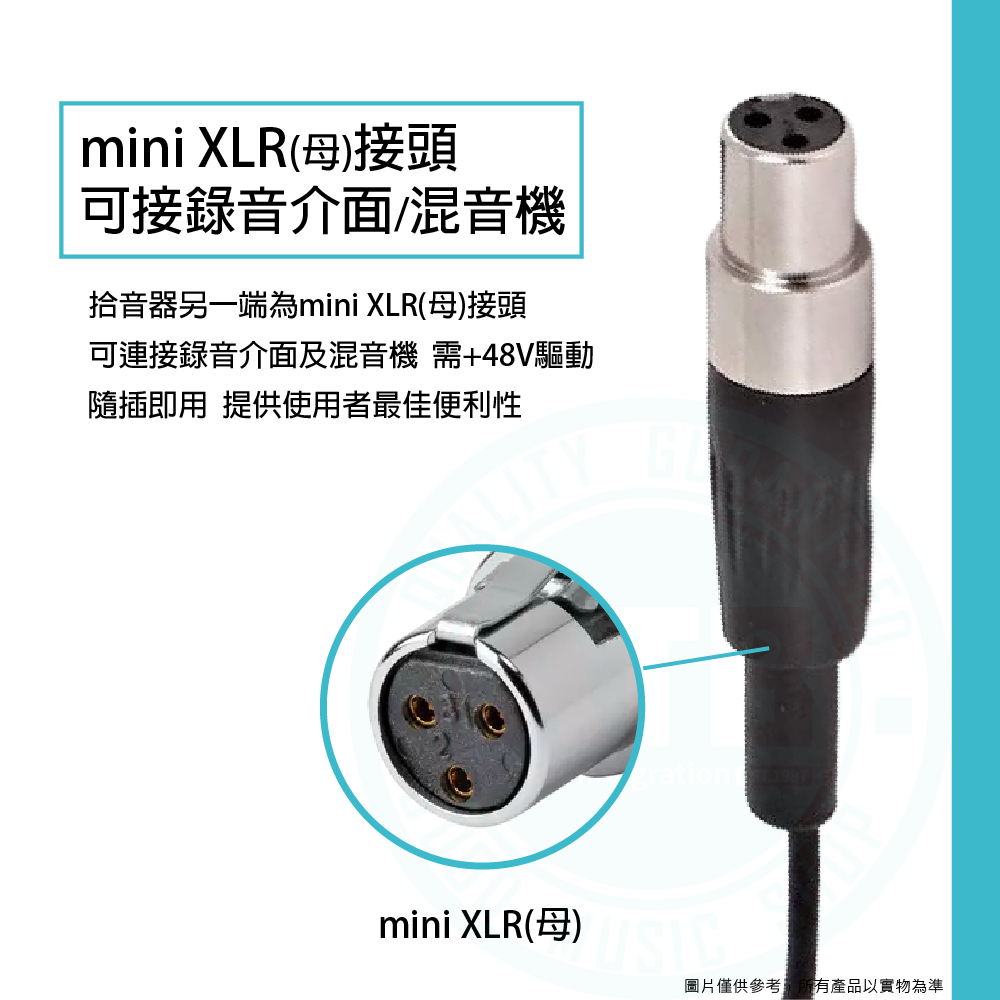 ◆ 拾音器另一端為mini XLR(母)接頭,可連接錄音介面及混音機,需+48V驅動
