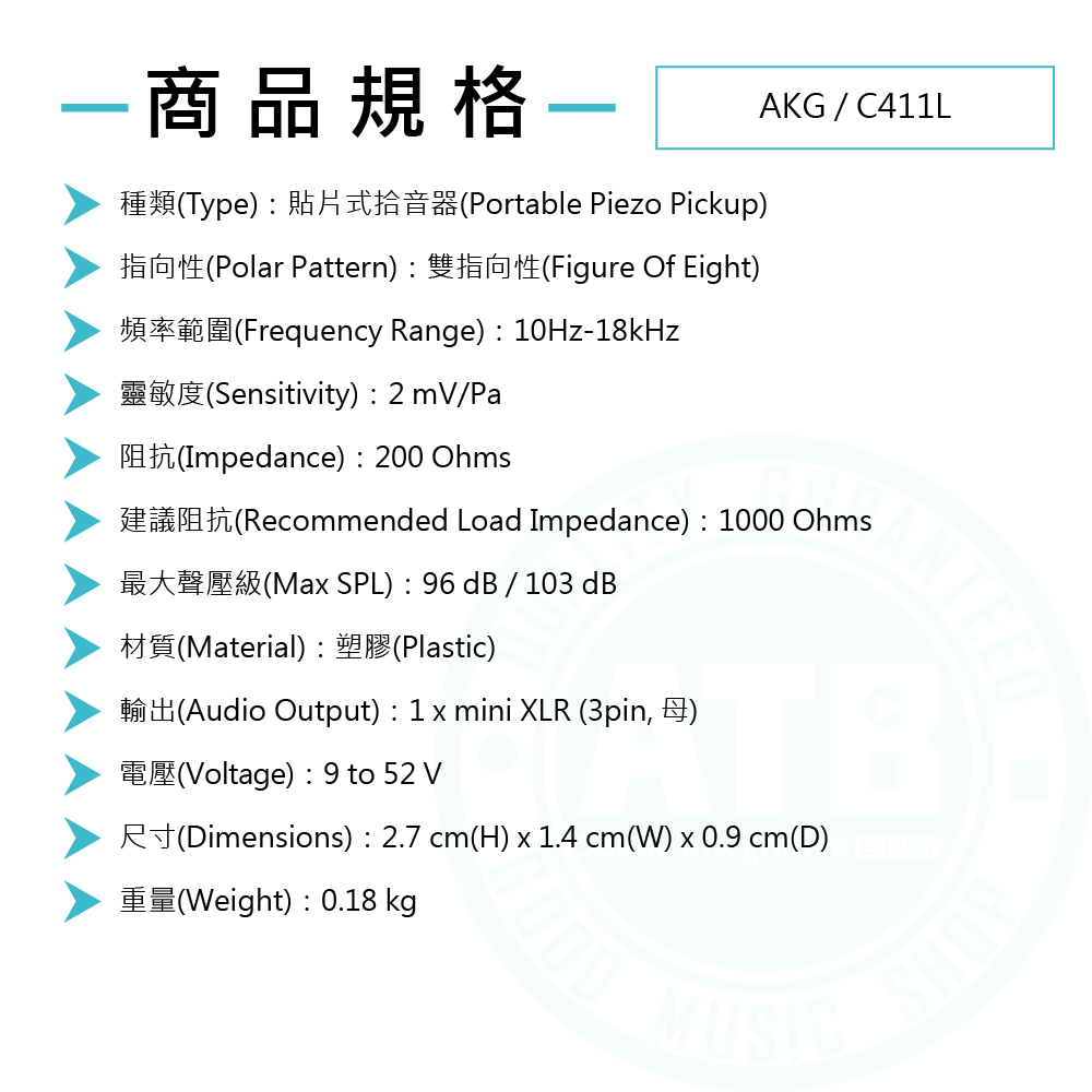 ◆ 採雙指向收音,頻率範圍10Hz-18kHz,靈敏度2 mV/Pa