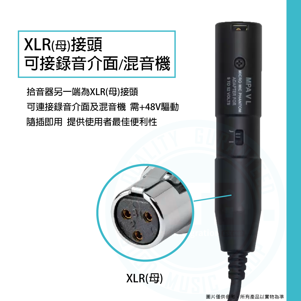 ◆ 拾音器另一端為XLR(母)接頭,可連接錄音介面及混音機,需+48V驅動