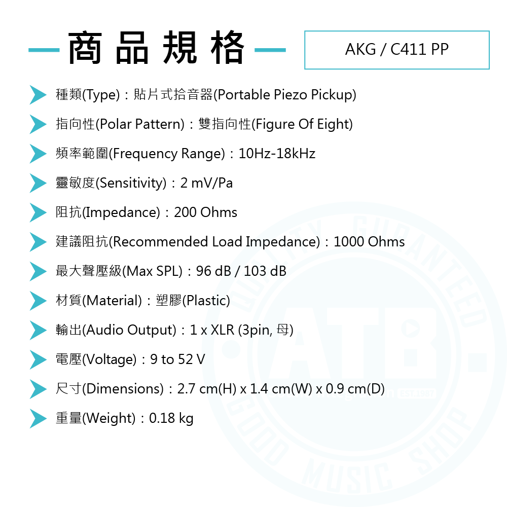 ◆ 採雙指向收音,頻率範圍10Hz-18kHz,靈敏度2 mV/Pa
