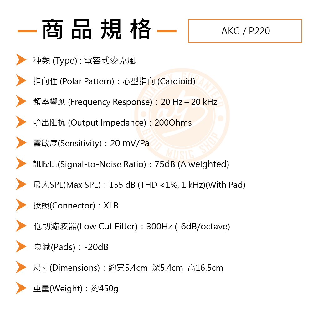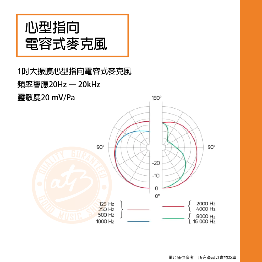◆ 1吋大振膜心型指向電容式麥克風,頻率響應20Hz – 20kHz,靈敏度20 mV/Pa