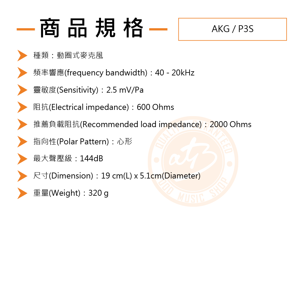 ◆ 心形指向收音,頻率響應40 - 20kHz、靈敏度 2.5 mV/Pa