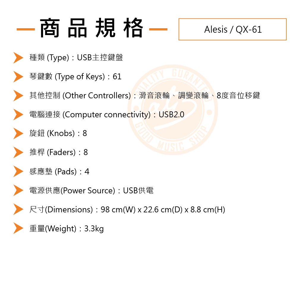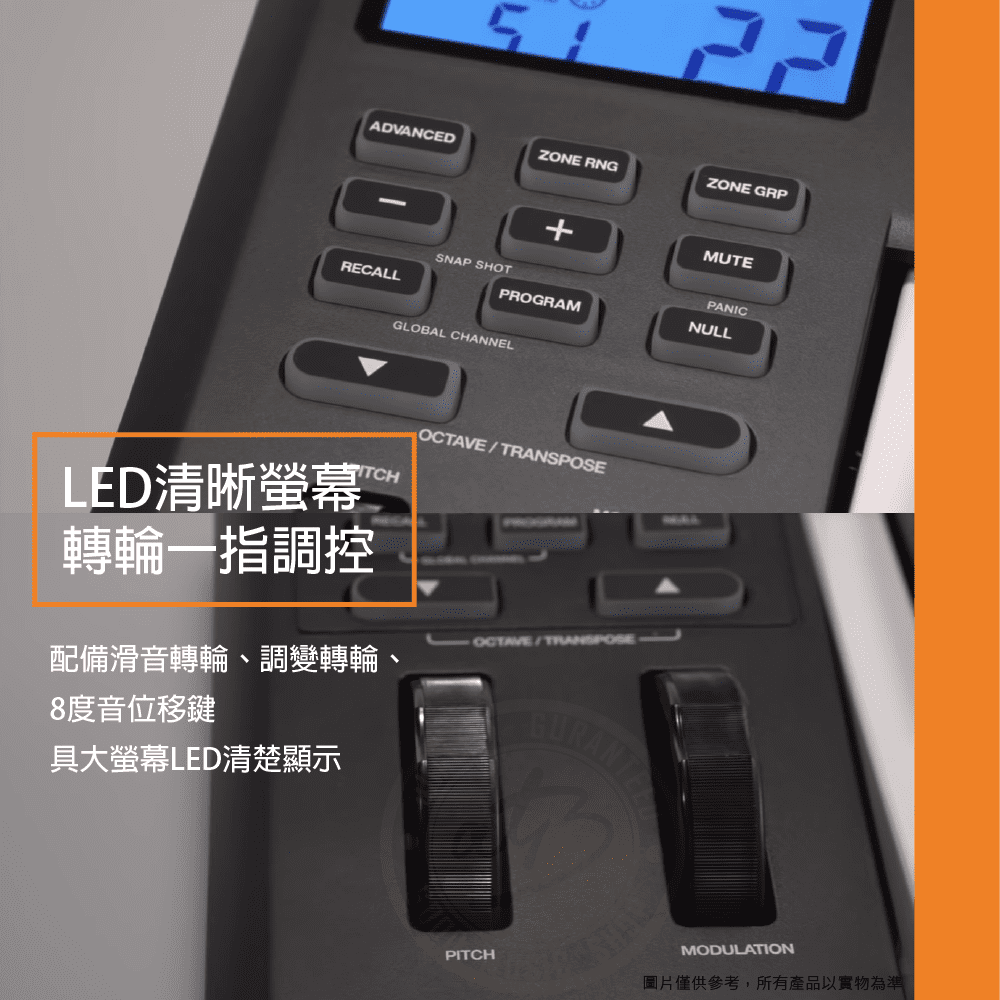 ◆ 配備滑音轉輪、調變轉輪、8度音位移鍵,具大螢幕LED清楚顯示