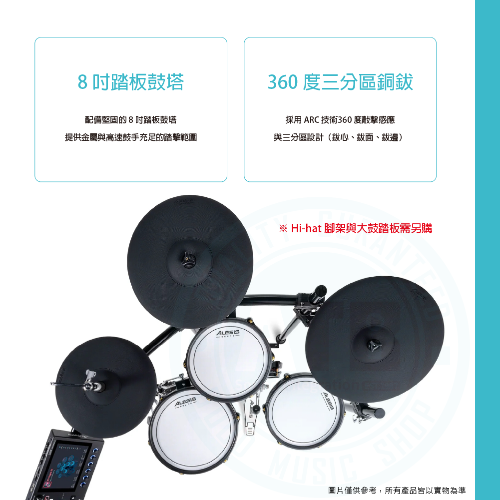 ◆ 空間節省且支援雙踏的 8 吋踏板鼓塔