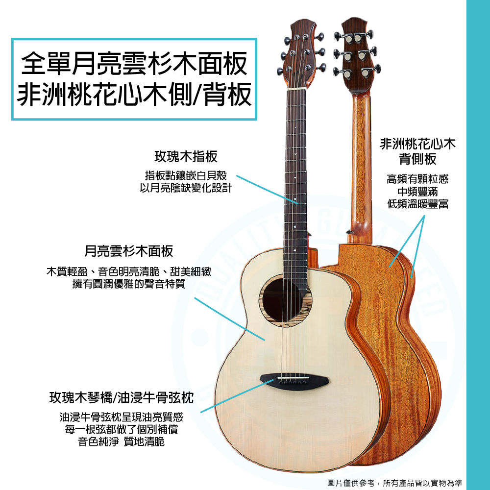 ◆ 全單月亮雲杉木面板,非洲桃花心木側背板,音色明亮清脆、甜美細緻