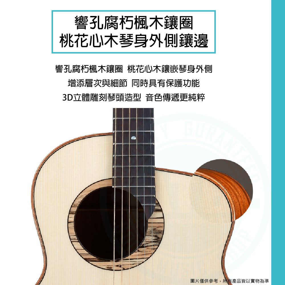 ◆ 響孔腐朽楓木鑲圈,桃花心木琴身外側鑲邊,美感與保護功能兼具