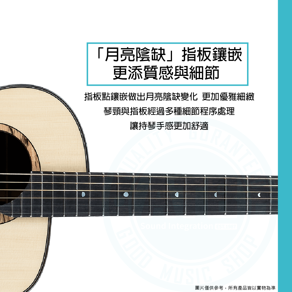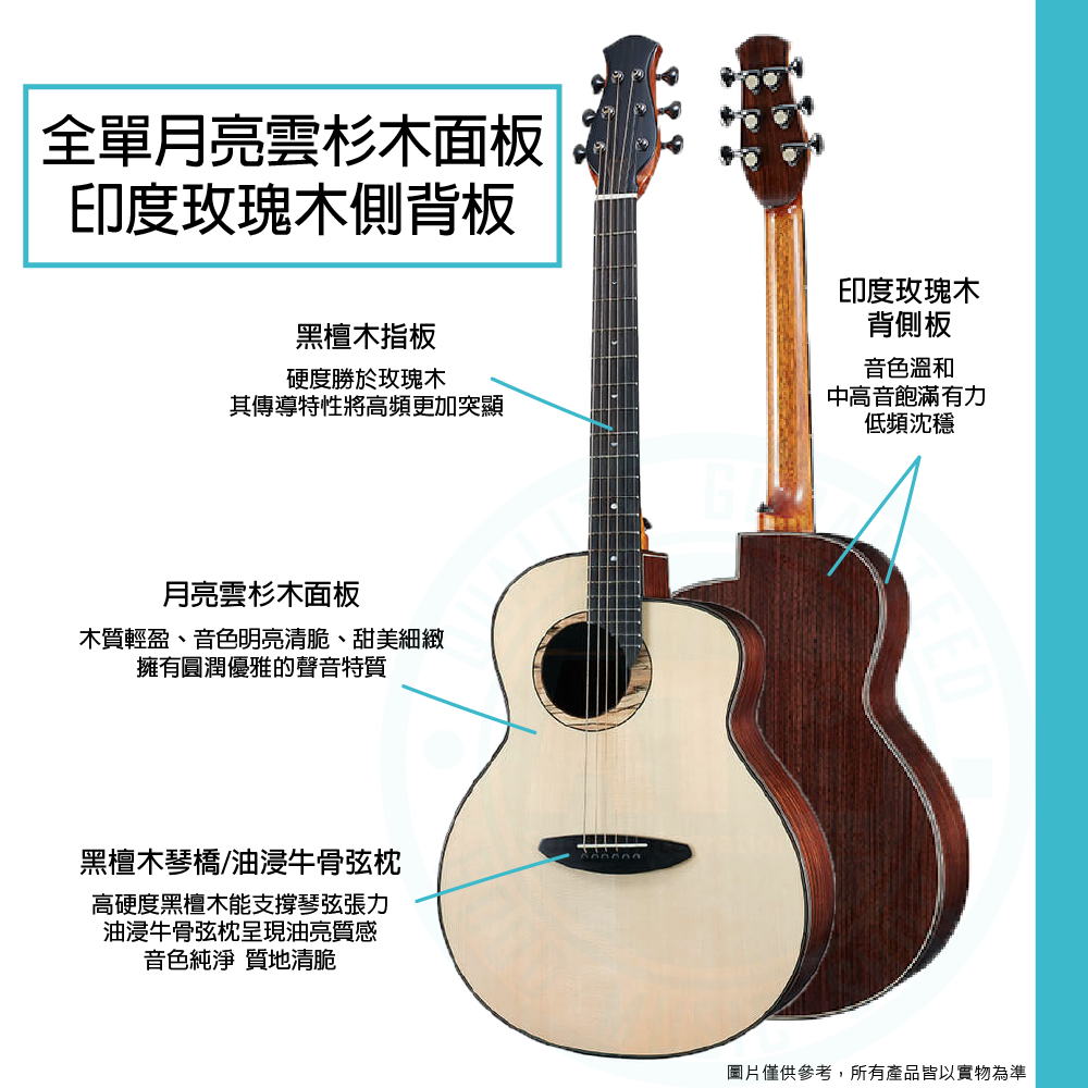 ◆ 全單板月亮雲杉木面板,印度玫瑰木側背板,音色明亮清脆、甜美細緻