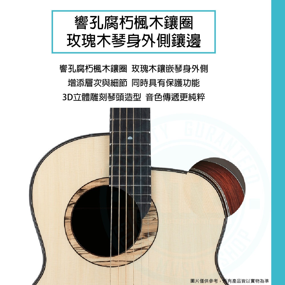 ◆ 響孔腐朽楓木鑲圈,玫瑰木琴身外側鑲邊,美感與保護功能兼具