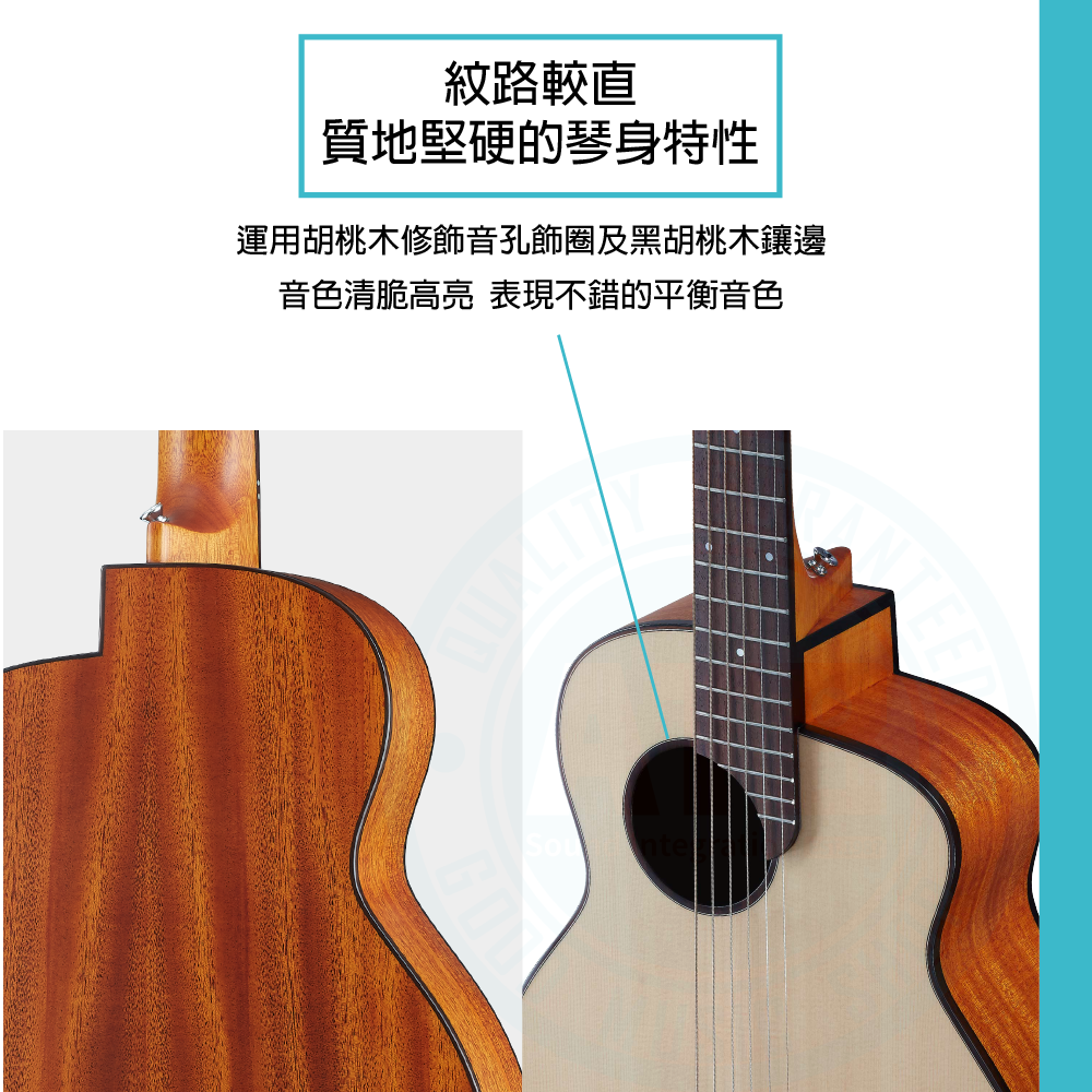 ◆ 運用胡桃木修飾音孔飾圈及黑胡桃木鑲邊,點綴合度的藝術感