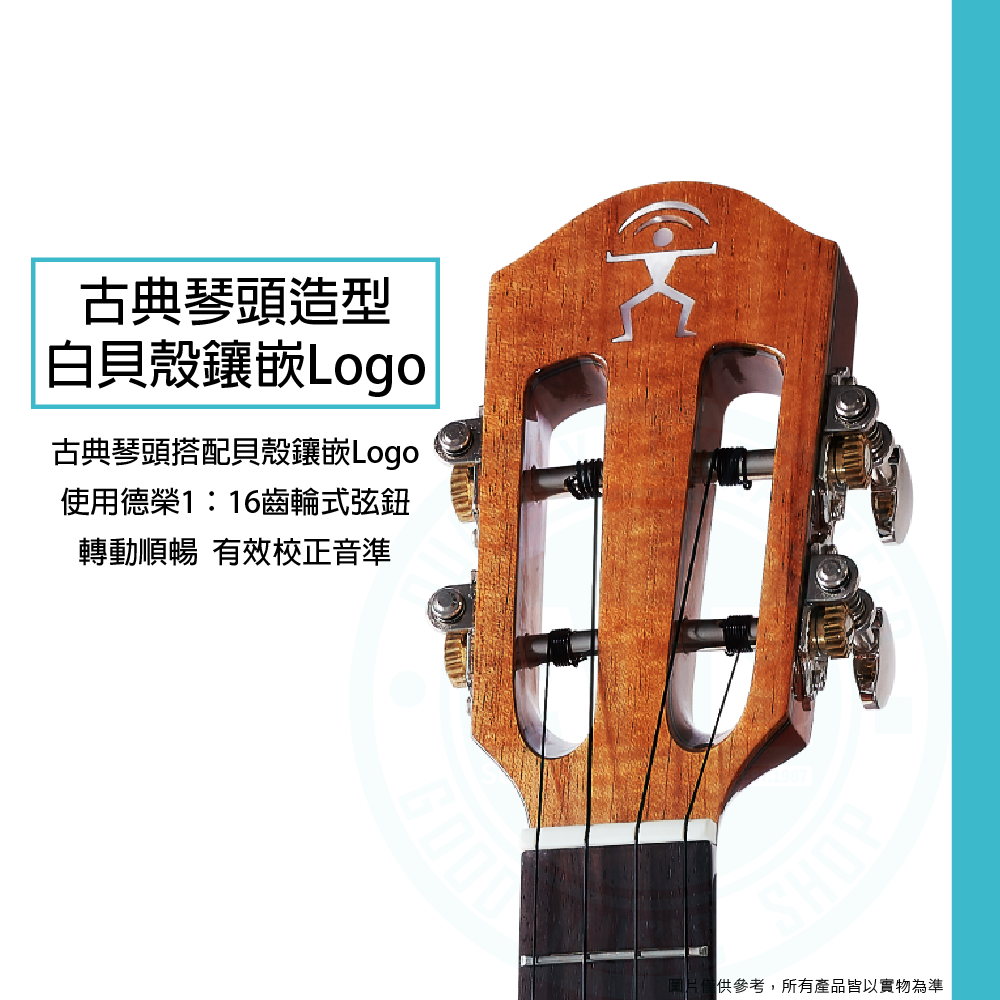◆ 古典琴頭造型,搭配白貝殼鑲嵌Logo