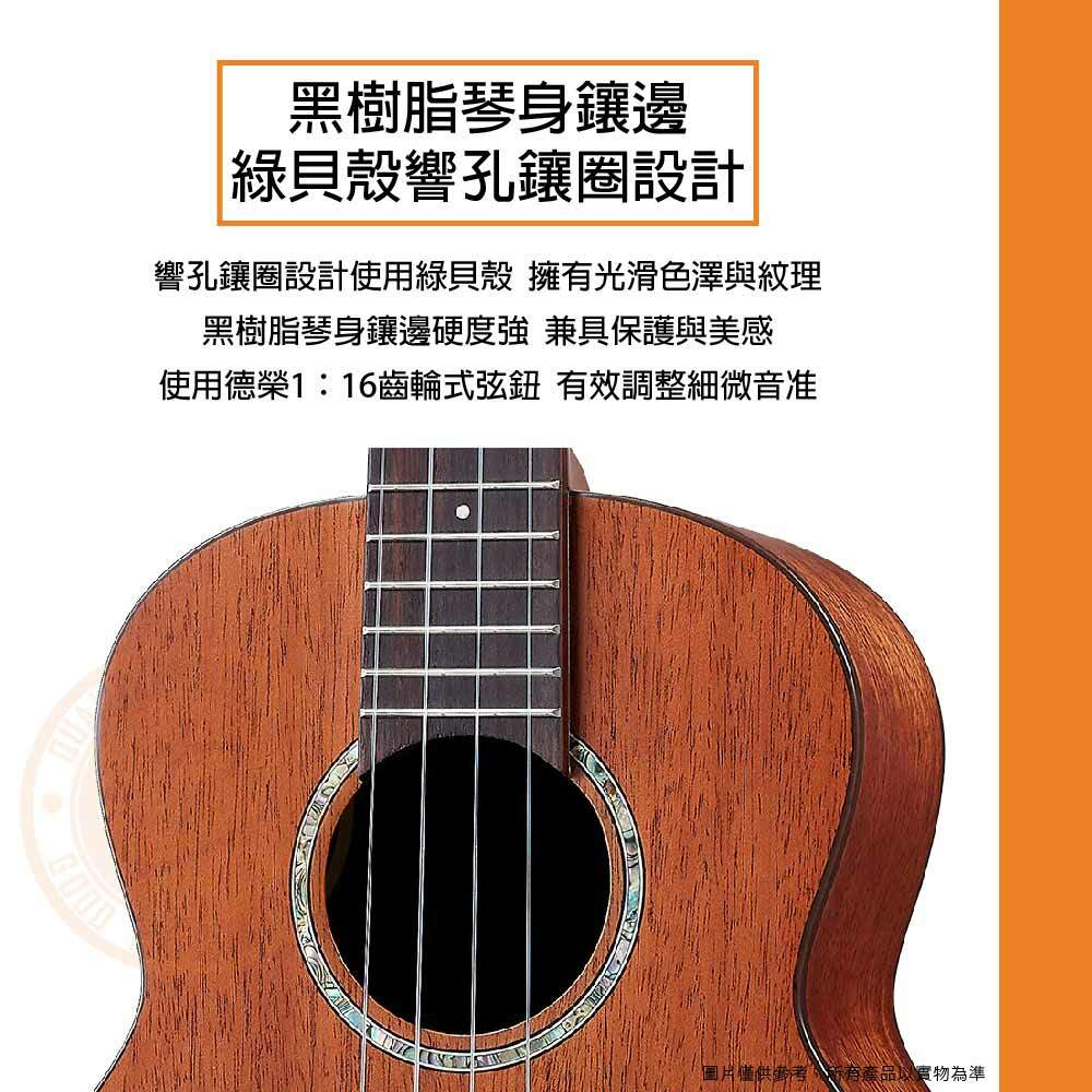 ◆ 琴面點綴綠貝殼響孔鑲圈,搭配黑樹脂琴身鑲邊,質感升級保護力佳
