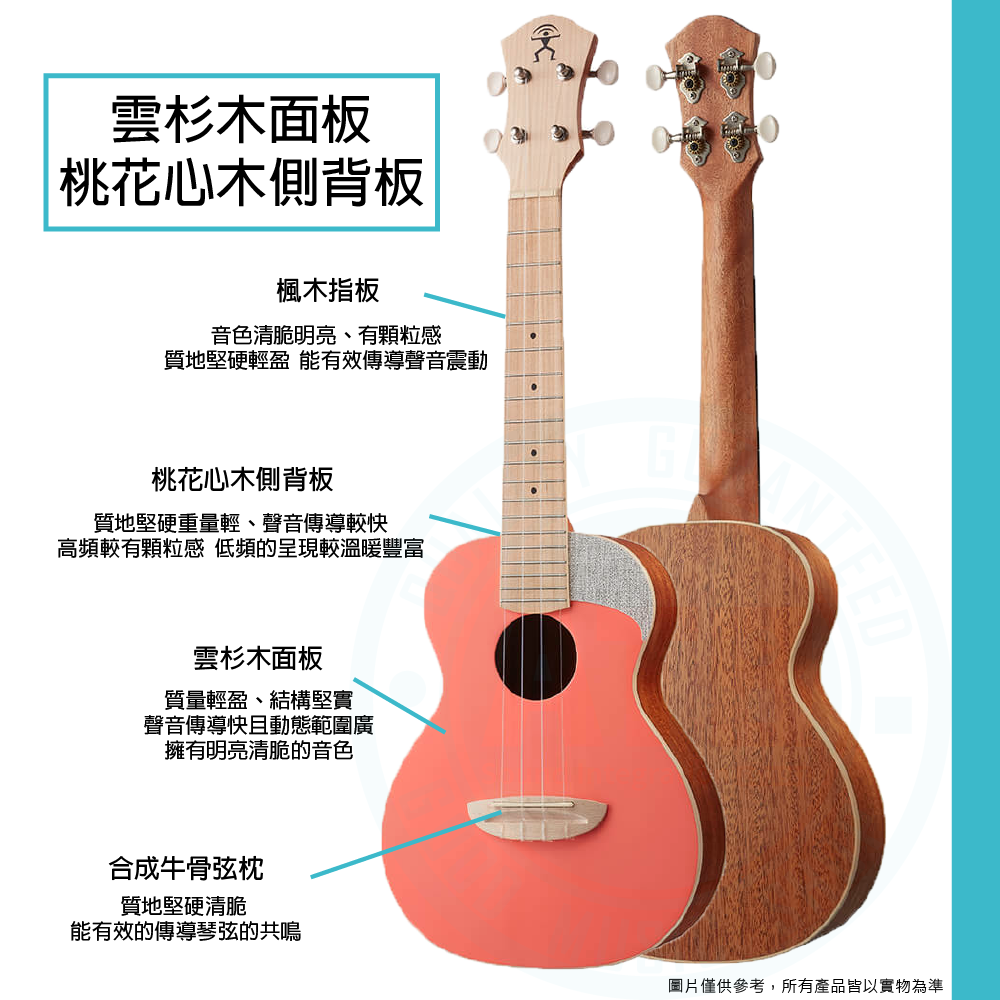 ◆ 雲杉木面板,搭配桃花心木側背板,擁有明亮清脆的音色