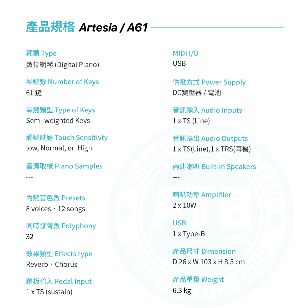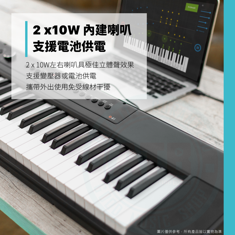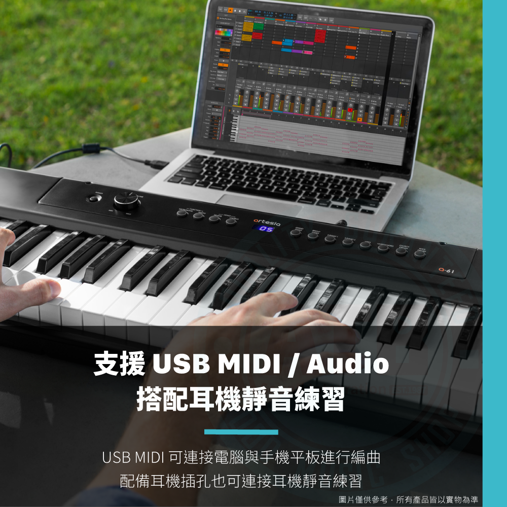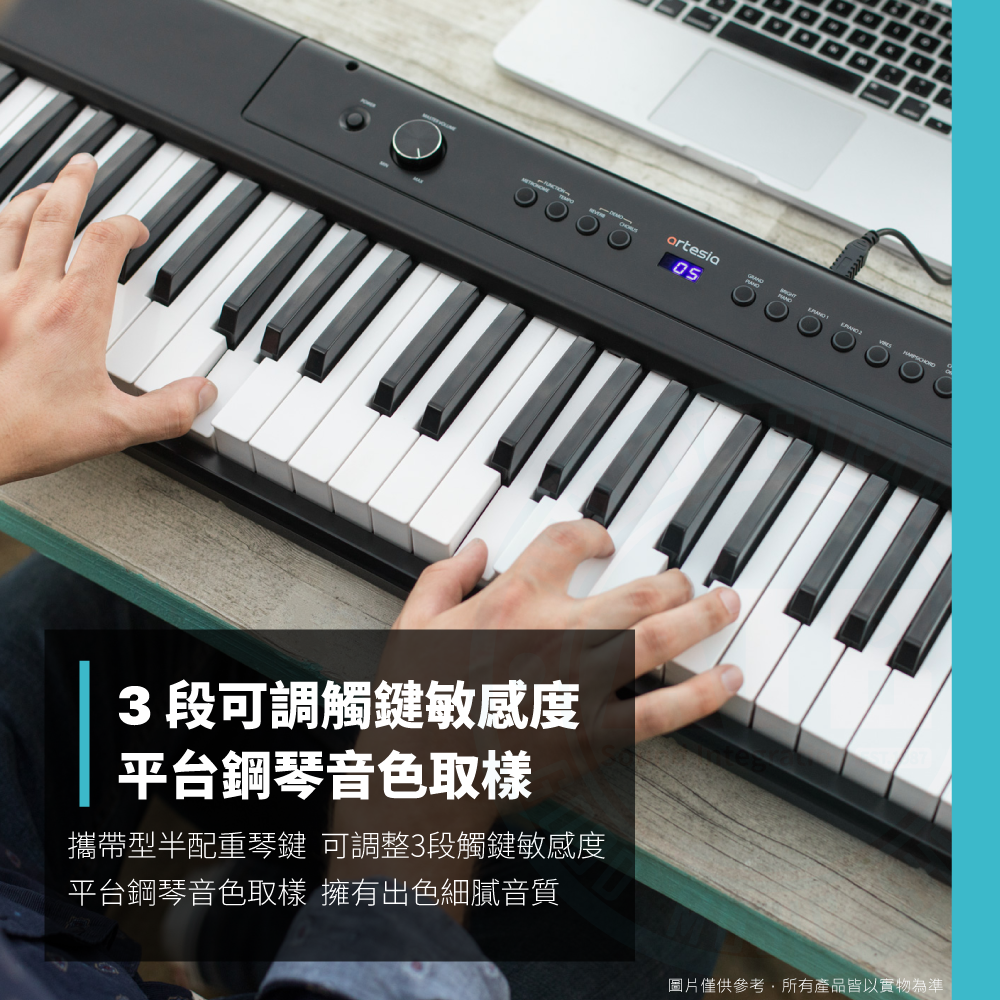 ◆ 攜帶型半配種琴鍵,可調整3段觸鍵敏感度,3層平台鋼琴音色取樣,共8種不同音色