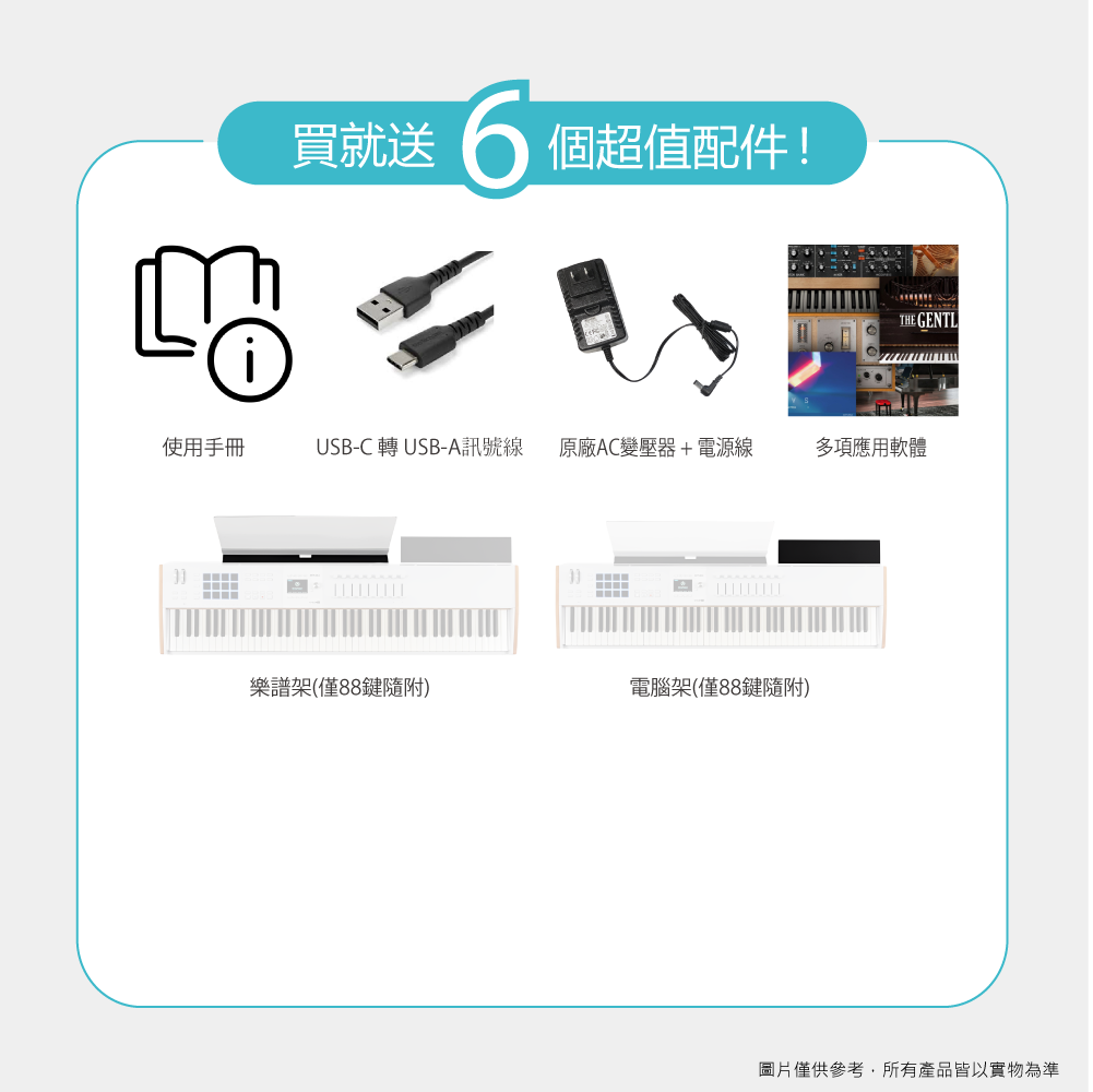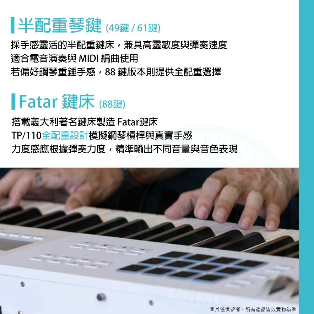 ◆搭載高品質半配重(49,61鍵)或全配重琴鍵(88鍵),演奏手感細膩