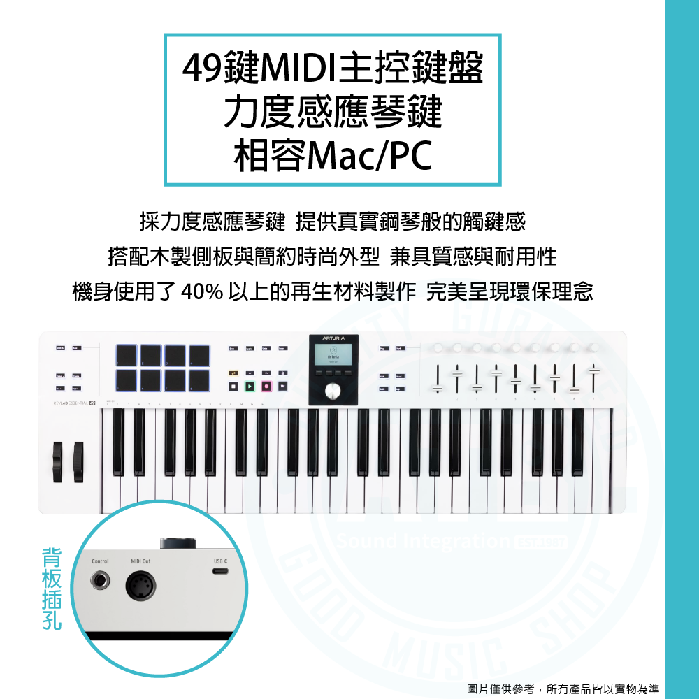 ◆ 49鍵MIDI主控鍵盤,採力度感應琴鍵,相容Mac/PC