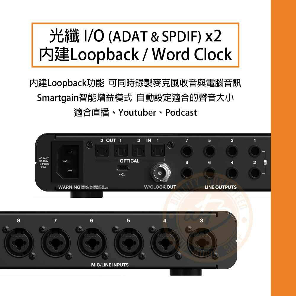 ◆ 光纖I/O (ADAT/SPDIF)x2、具備Loopback、Word Clock功能