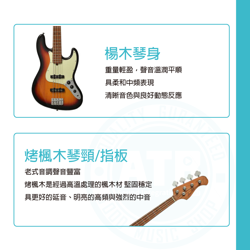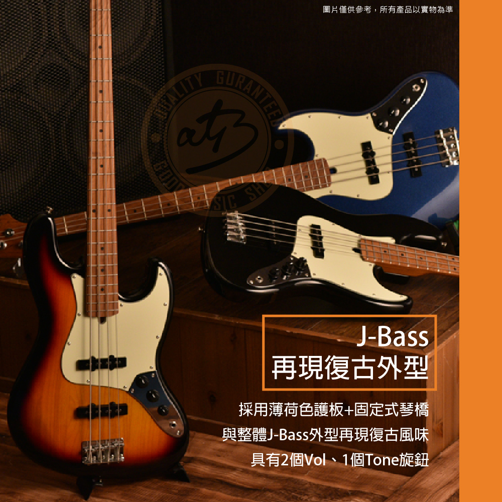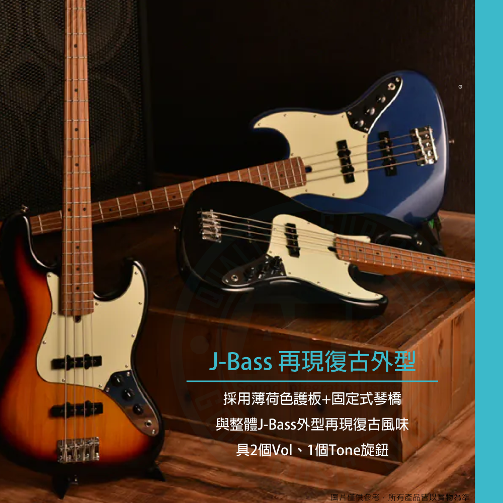 ◆ 具J-Bass外型+薄荷色護板+固定式琴橋,再現復古風味