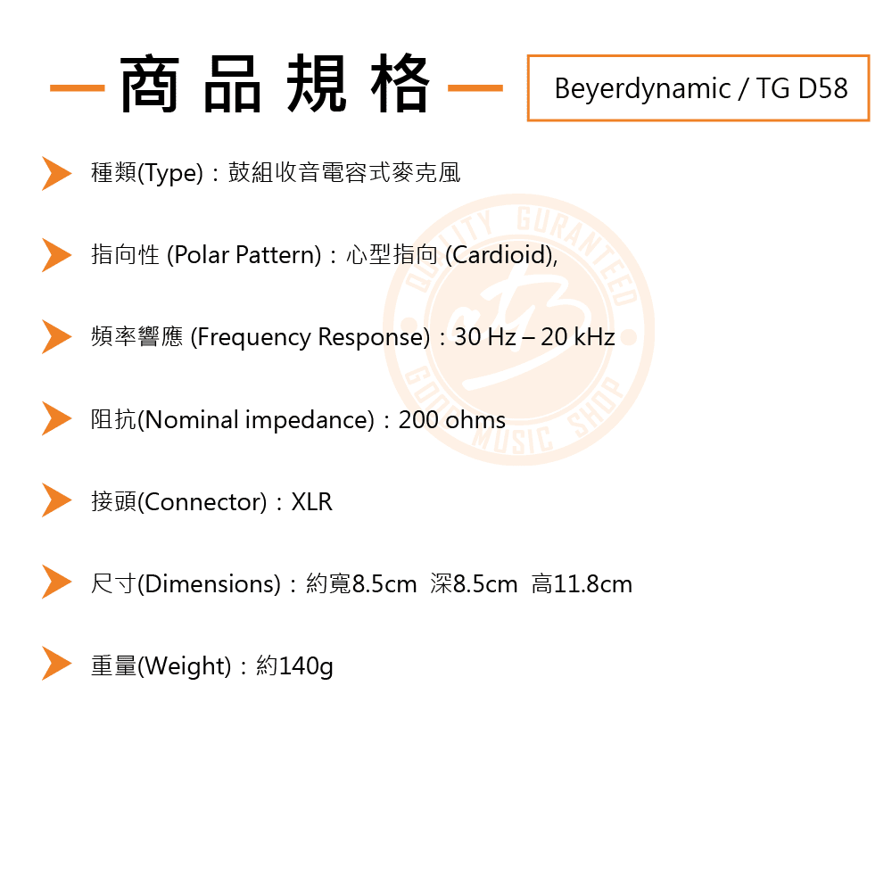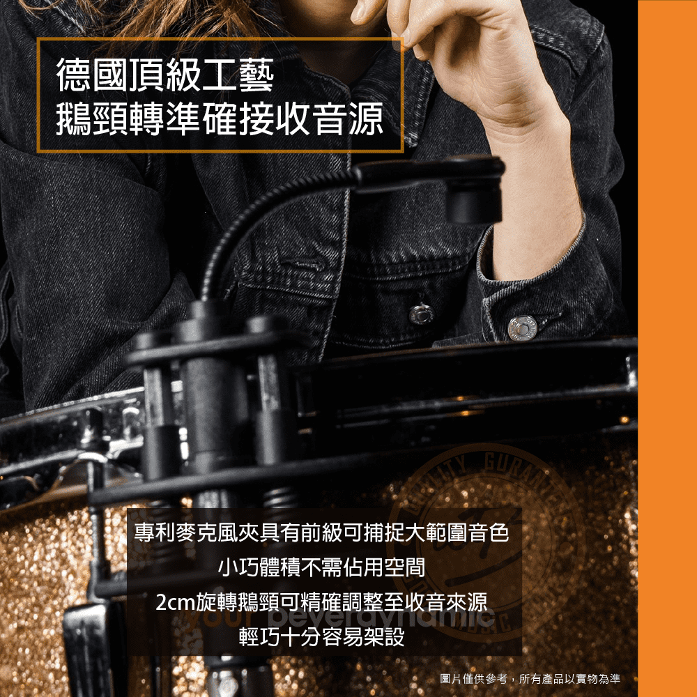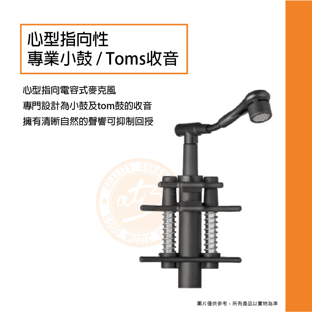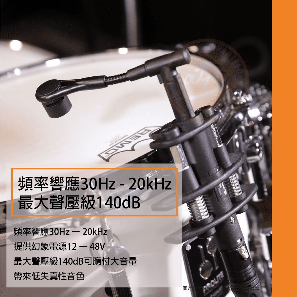 ◆ 心型指向電容式麥克風,專門為小鼓及tom鼓的收音,擁有清晰自然的聲響可抑制回授