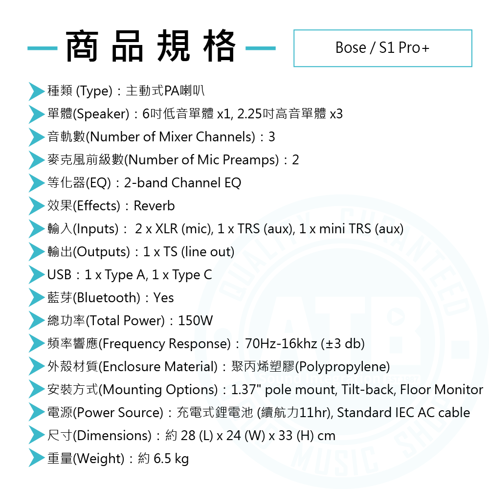 ◆ 6吋低音單體、2.25吋高音單體x3、總功率150W