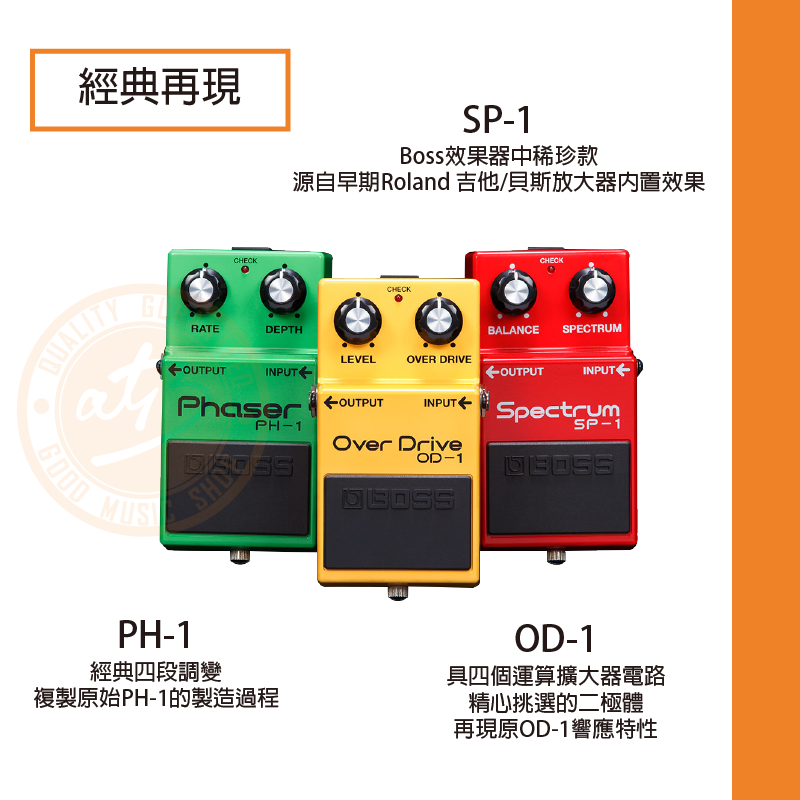 ◆首批單顆效果器重新發行,包含OD-1、PH-1、SP-1