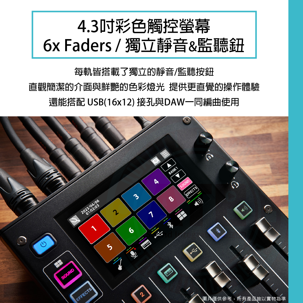 ◆ 搭載4.3吋彩色觸控螢幕、6x Faders、獨立靜音&監聽鈕