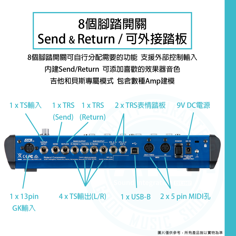 ◆ 具8個腳踏開關、Send & Return,可外接踏板
