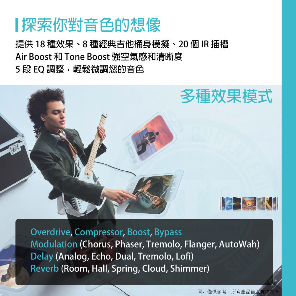 ◆提供 18 種效果、8 種經典吉他桶身模擬、20 個 IR 插槽