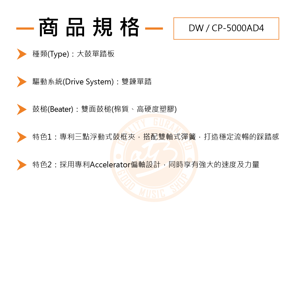 ◆ 美國知名爵士鼓品牌DW打造的大鼓單踏板