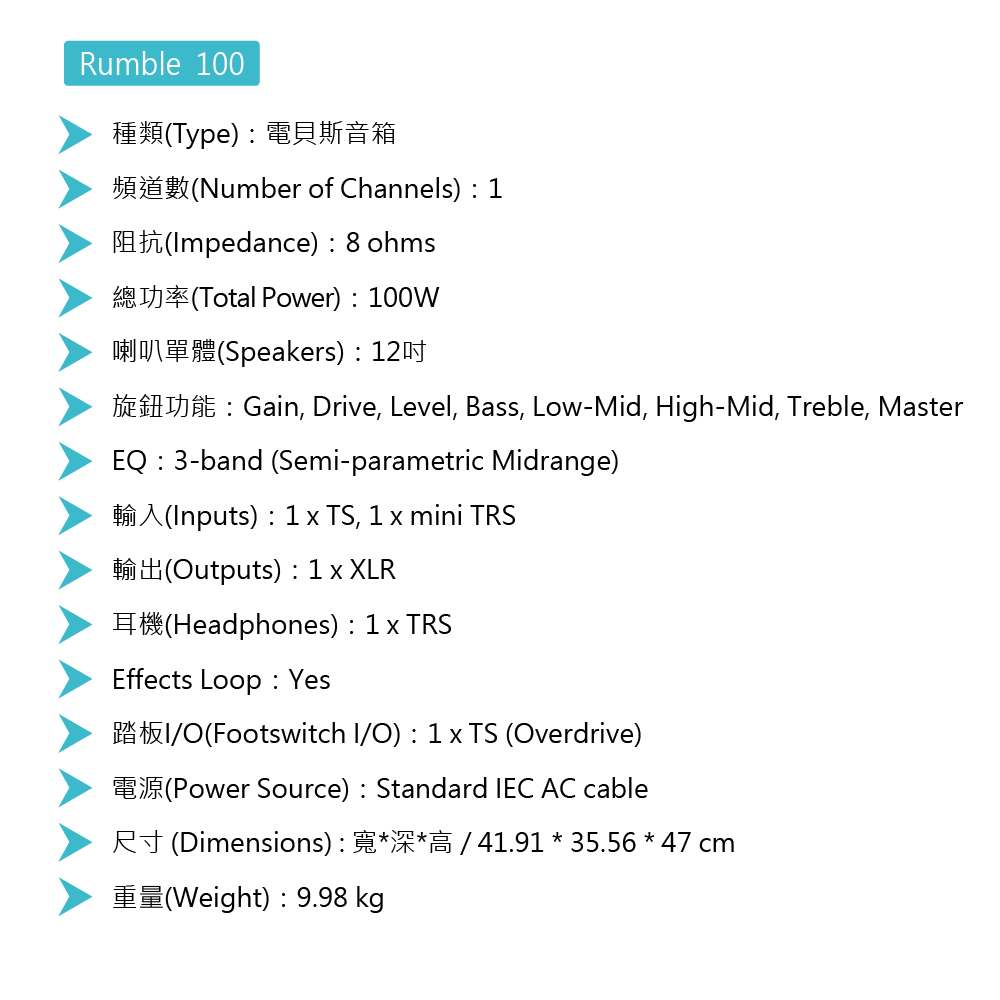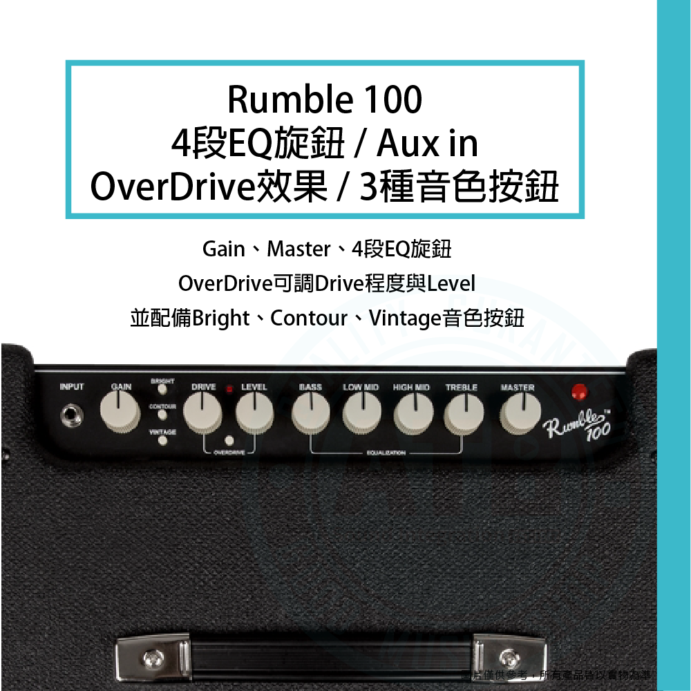 ◆ Rumble100具4段EQ旋鈕,Aux in、OverDrive效果、3種音色按鈕