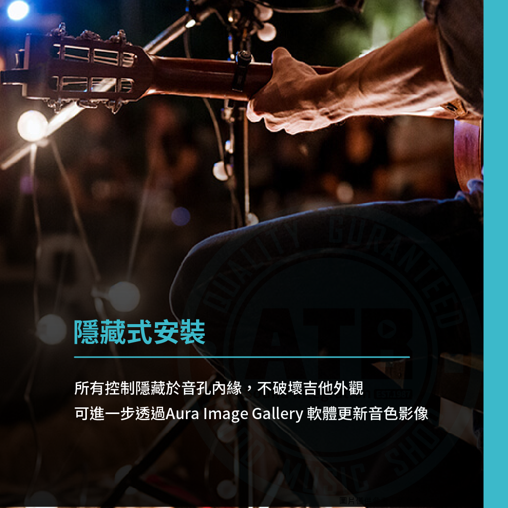 ◆ 音量與影像切換旋鈕藏於音孔邊緣,維持吉他外觀