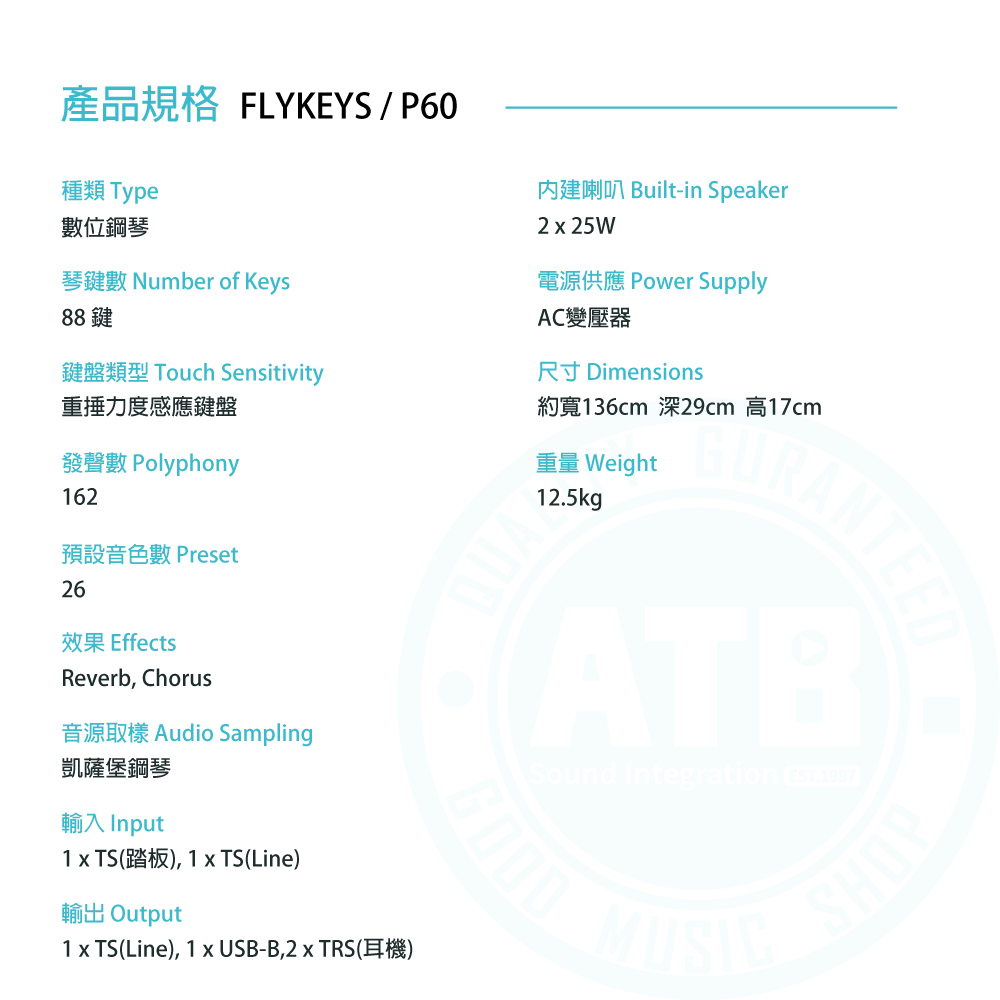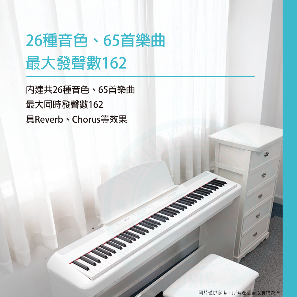 ◆ 最大同時發聲數162,內建共26種音色、65首樂曲