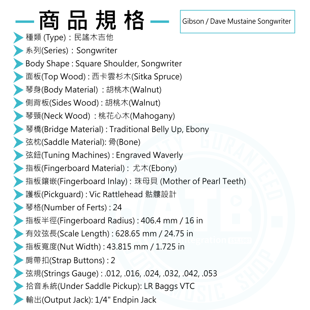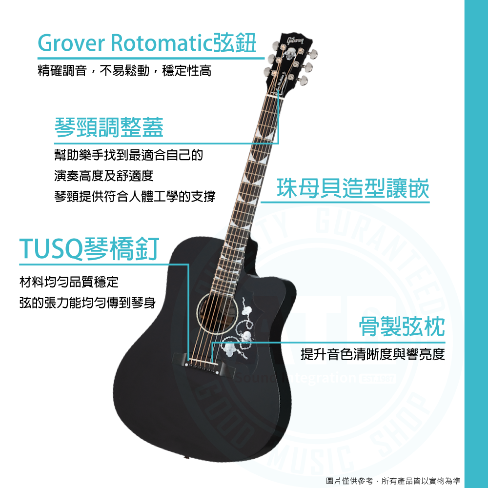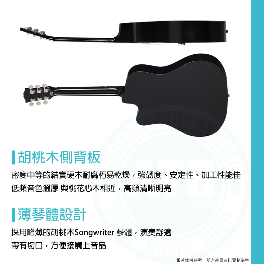 ◆採略薄的胡桃木Songwriter 琴體,演奏舒適帶有切口,方便接觸上音品