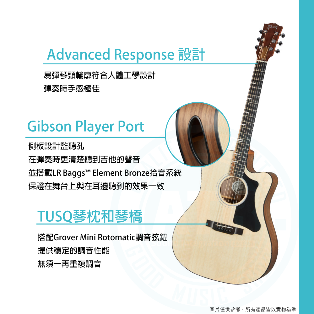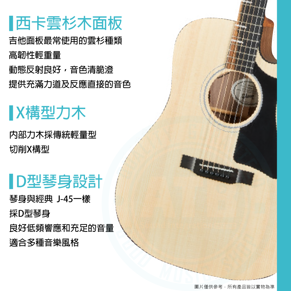◆J-45的D型 琴身切角設計設計使得彈奏更為舒適◆Grover Mini Rotomatic調音弦鈕 供穩定的調音性能