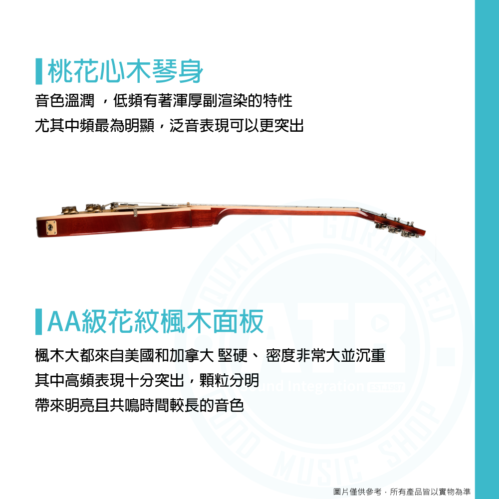 ◆無減重實心桃花心木琴身,搭配 AA 級虎紋楓木面板,音色厚實具延音