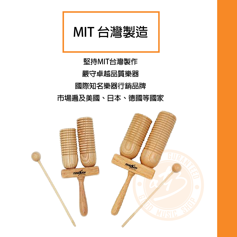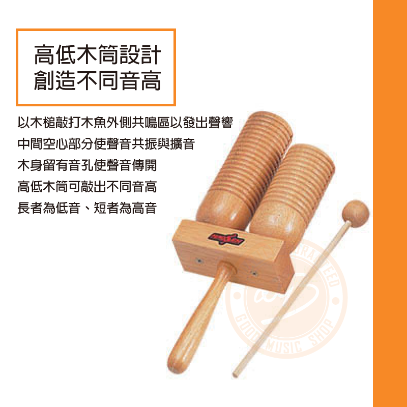 ◆開口向上的中空圓木樂器,其設計為長短各一,長者音高偏低,短者反之。