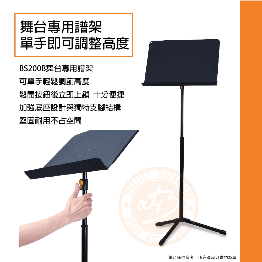 ◆ BS200B舞台專用譜架可單手輕鬆調節高度,鬆開按鈕後立即上鎖,十分便捷
