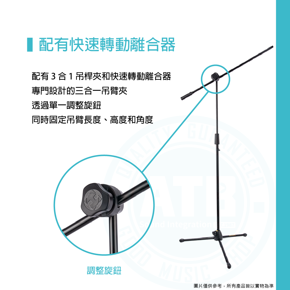 ◆三合一吊臂夾透過單一調整旋鈕同時固定吊臂長度、高度和角度