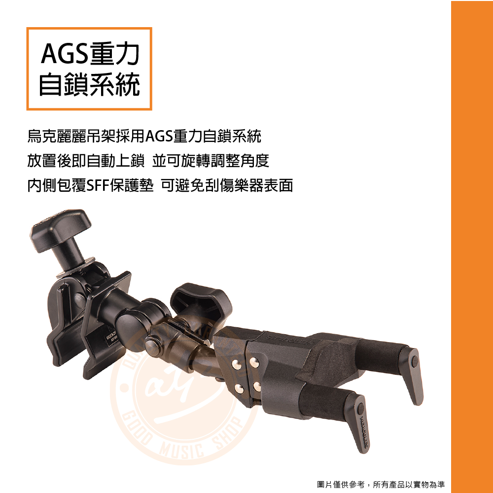 ◆ 烏克麗麗吊架採用AGS重力自鎖系統,放置後即自動上鎖,並可旋轉調整角度