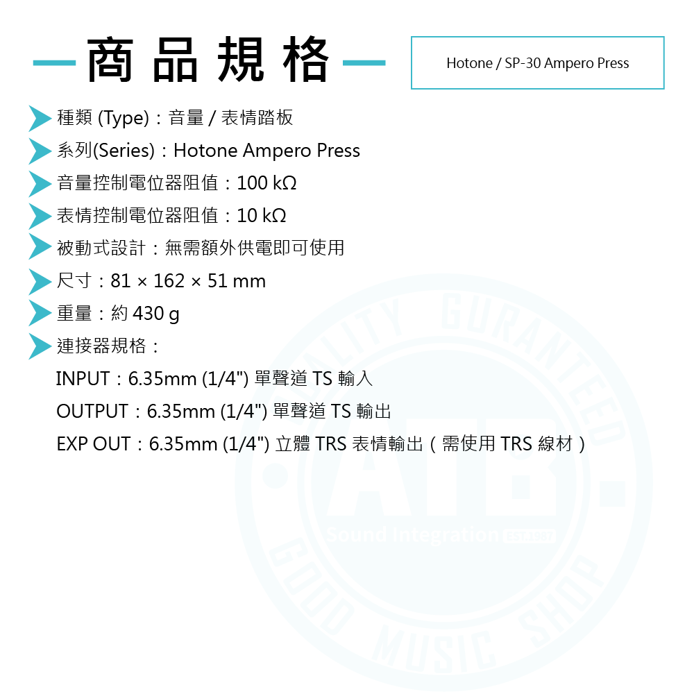 ◆ 內建 100kΩ 音量電位器與 10kΩ 表情電位器,確保平順、精準的音量與參數控制