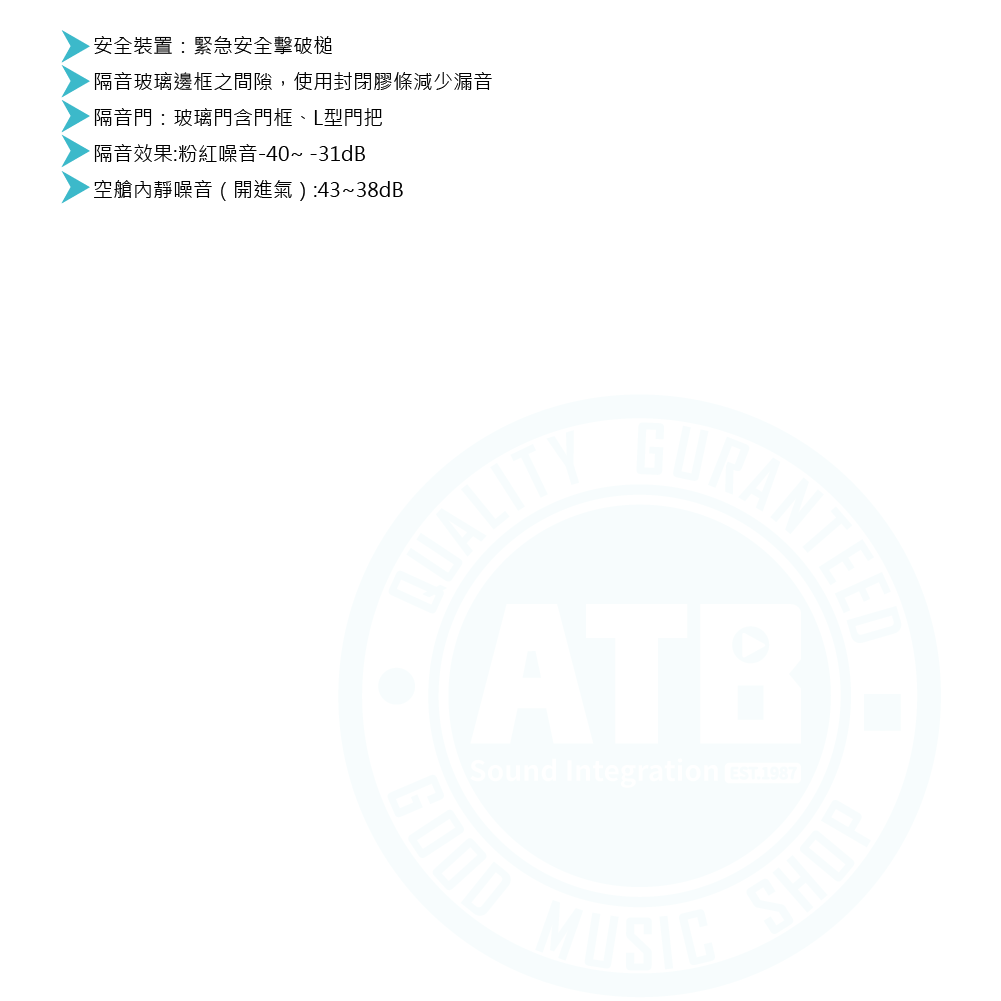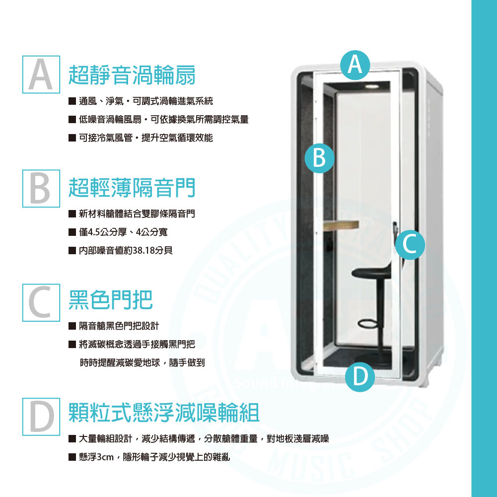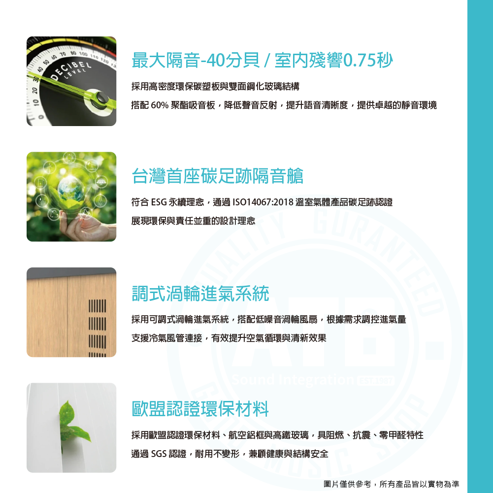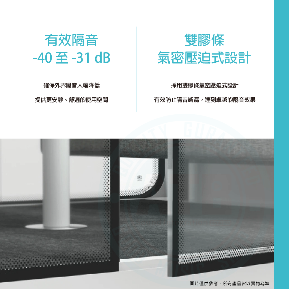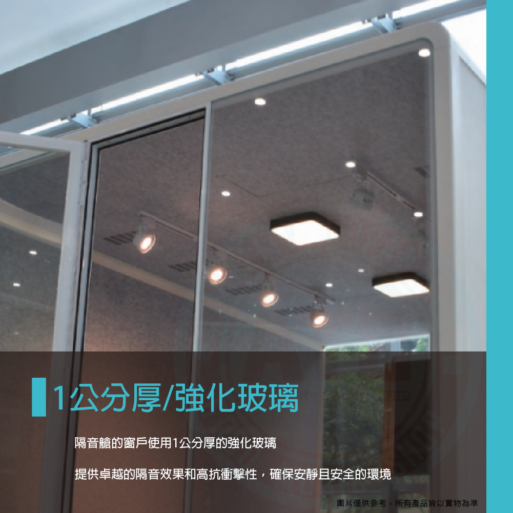 ◆ 最大隔音-40分貝,殘響0.75秒,鋼化玻璃/吸音板