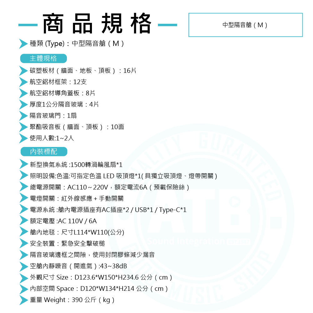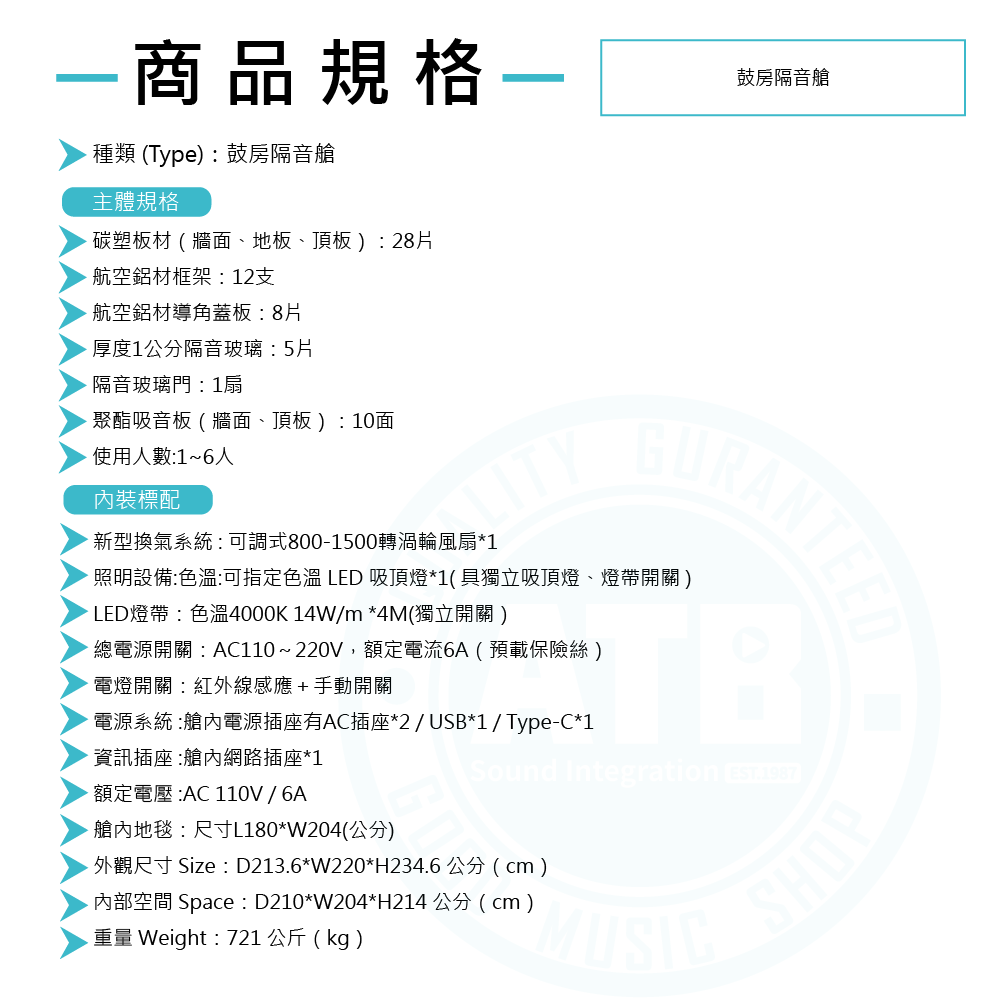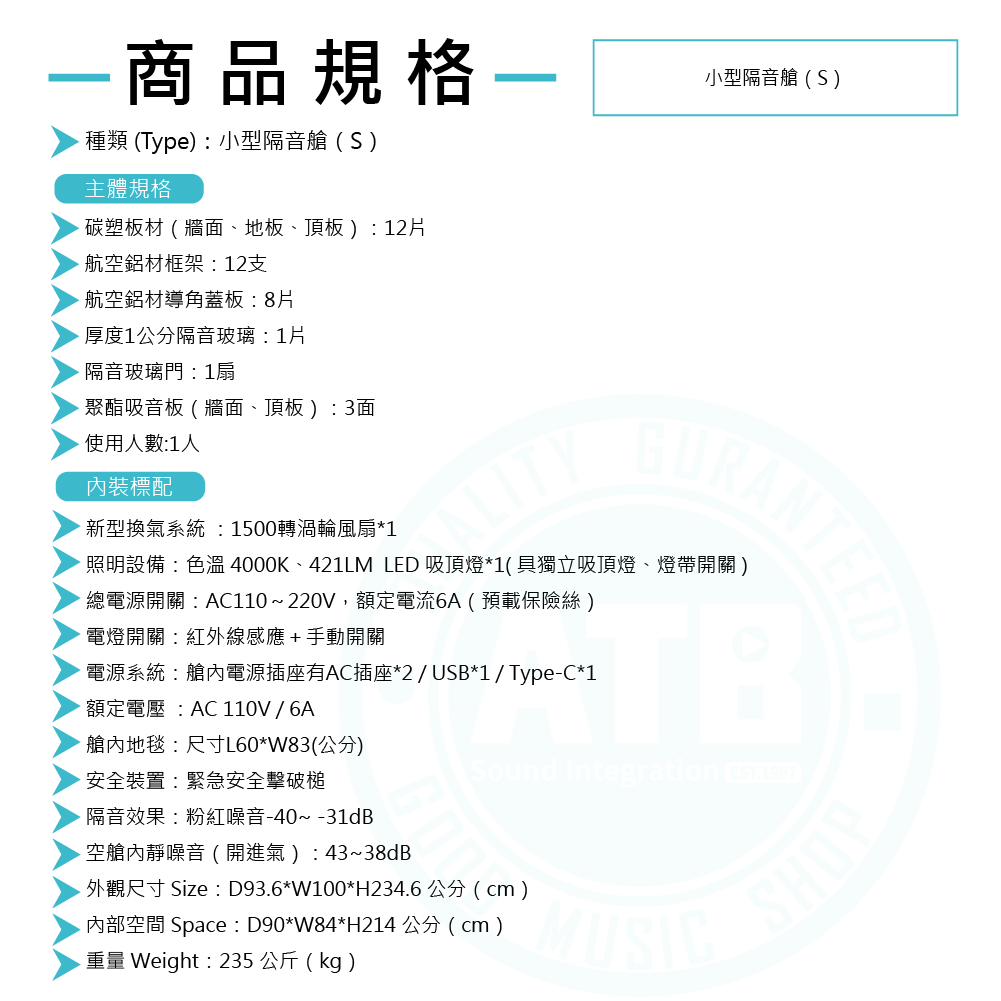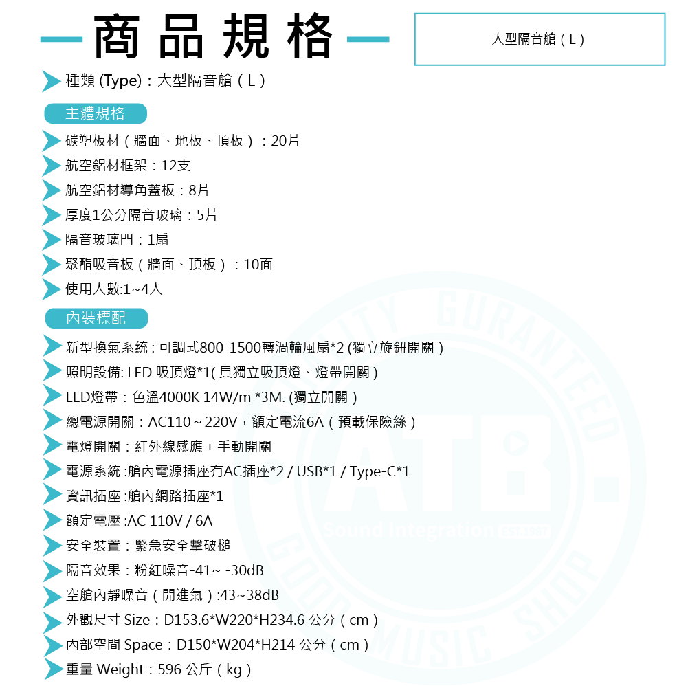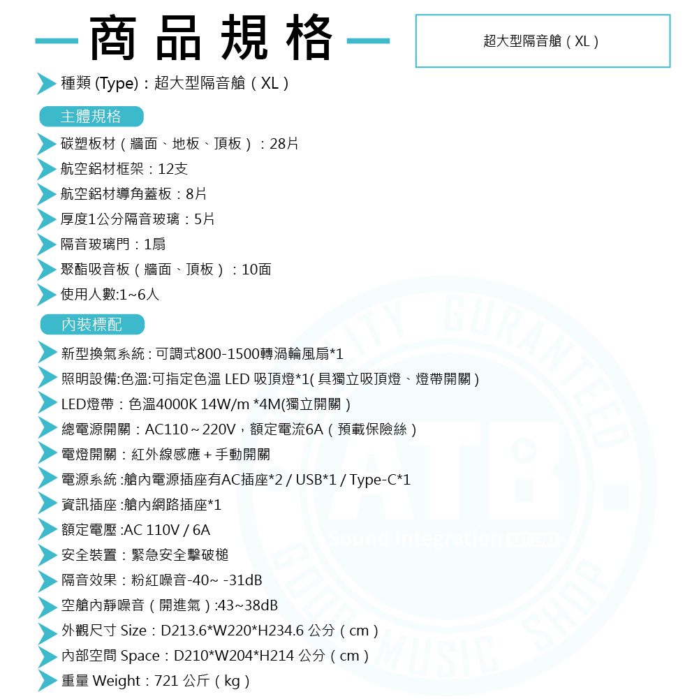 ◆ 最大隔音-40分貝,殘響0.75秒,鋼化玻璃/吸音板