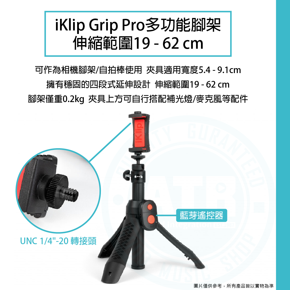 ◆ iKlip Grip Pro多功能腳架,伸縮範圍19 - 62 cm,夾具適用寬度5.4 - 9.1cm