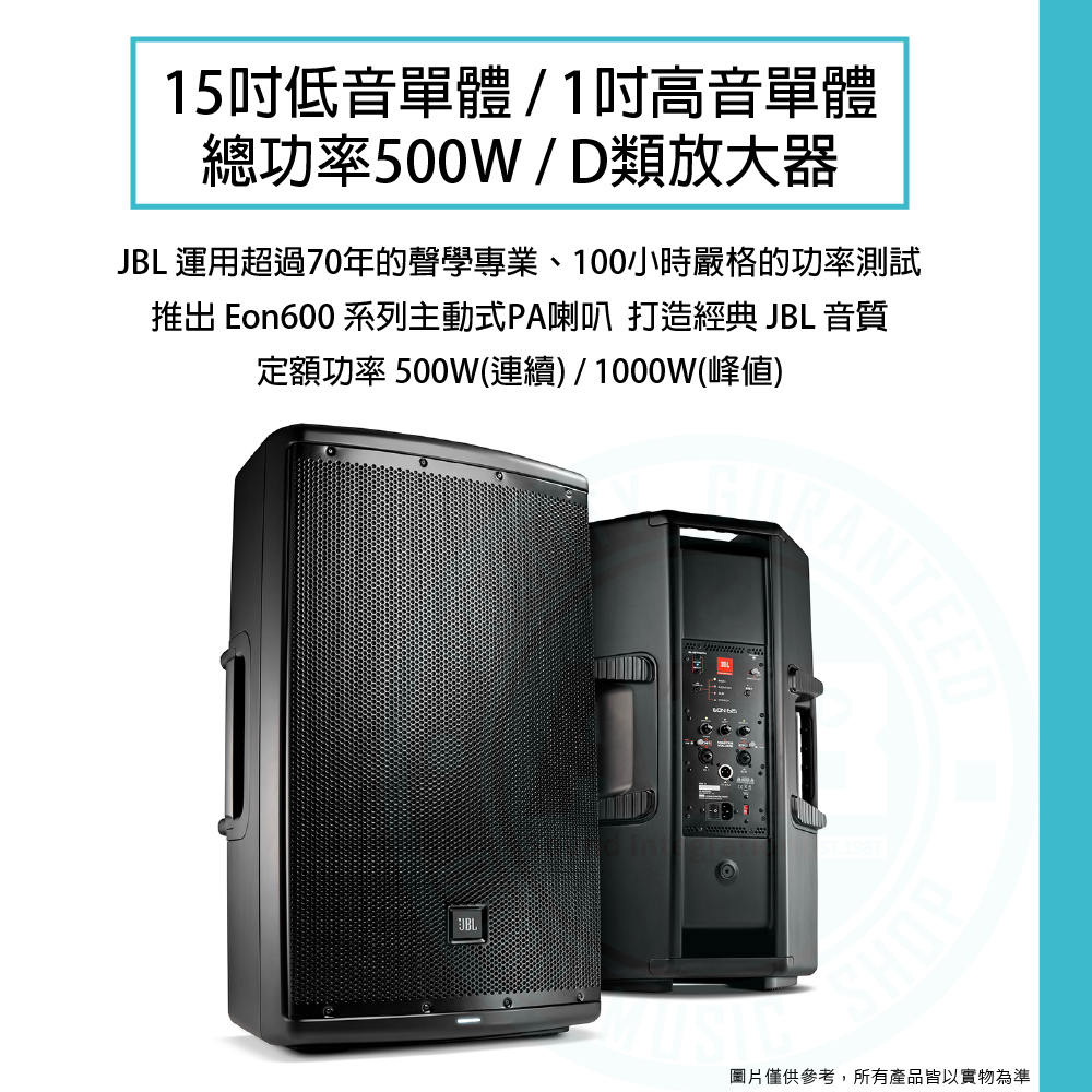◆ 15吋低音單體、1吋高音單體、總功率500W(連續)