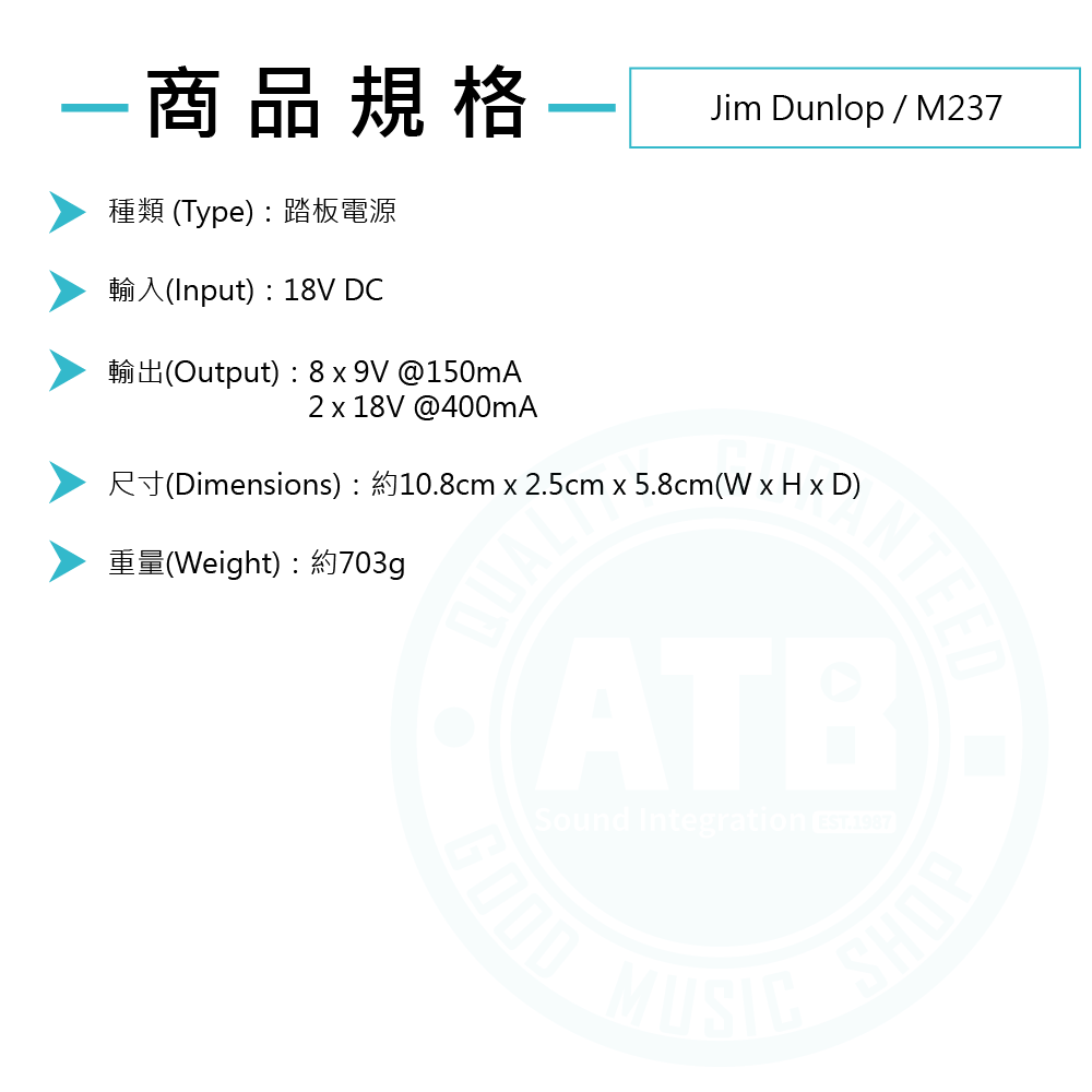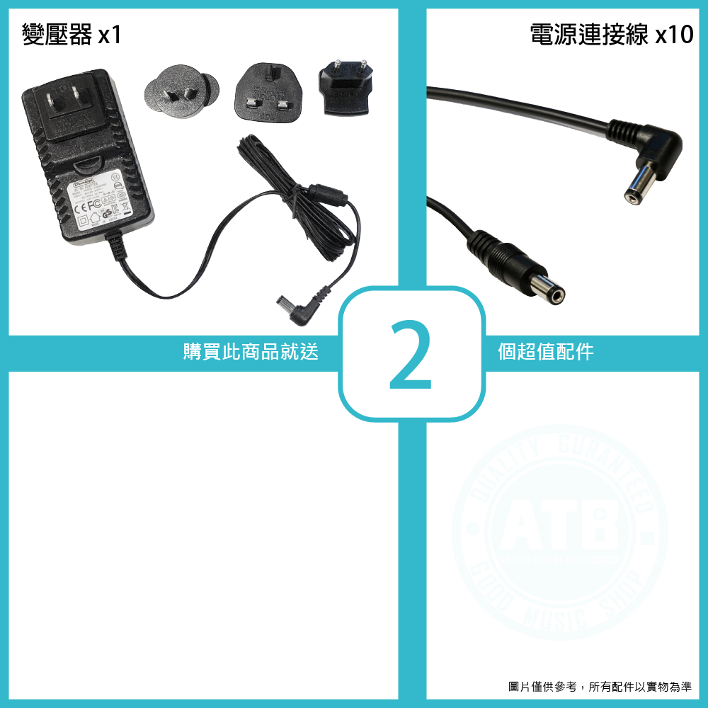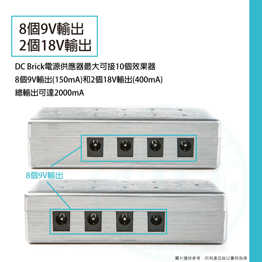 ◆ DC Brick電源供應器最大可接10個效果器,8個9V輸出(150mA)和2個18V輸出(400mA),總輸出可達2000mA