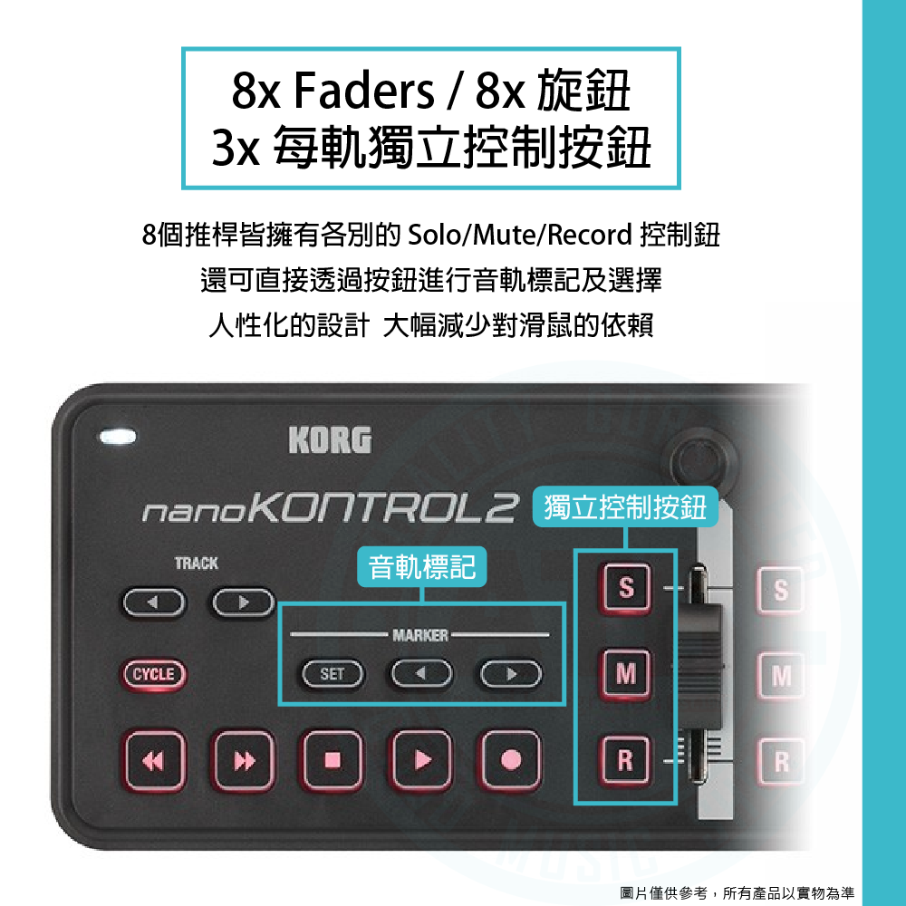 ◆ 搭載 Faders x8、旋鈕 x8,每軌具獨立控制按鈕