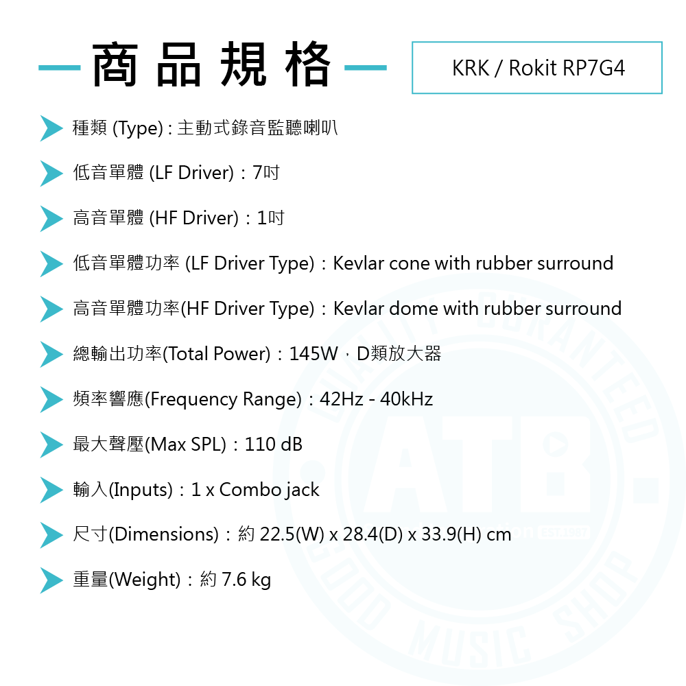 ◆ 7吋低音單體、1吋高音單體,採D類放大器、總功率145W