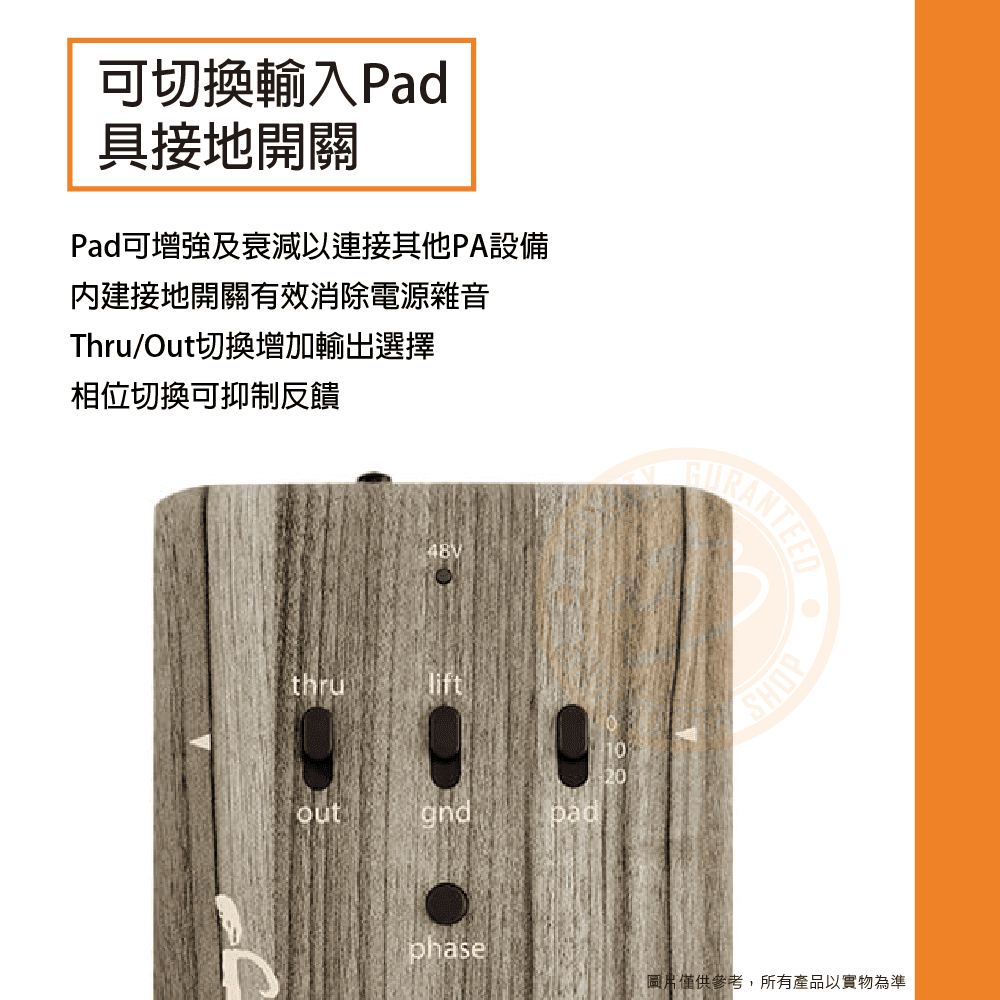 ◆ Pad可增強及衰減以連接其他PA設備,內建接地開關有效消除電源雜音