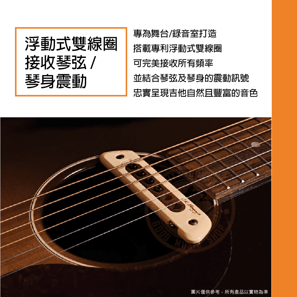 ◆ 專利浮動式雙線圈完美接收所有頻率,並結合琴弦及琴身的震動訊號,忠實呈現吉他自然且豐富的音色